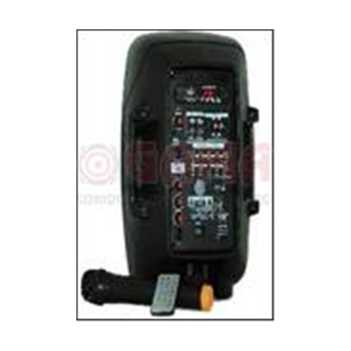 “Bafle de 8″” amplificado con batería recargable y un micrófono inalámbrico.